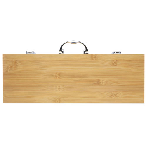 Bambusowy, 5-częściowy zestaw do grillowania z łopatką (40 x 9,5 cm), szczypcami (34,5 x 6 cm), widelcem (38,5 x 3 cm), nożem (38,5 x 3 cm) i szczotką (38 x 4,3 cm). Zestaw jest dostarczany w bambusowym pudełku upominkowym (46 x 16,2 x 7,4 cm). Uchwyty i pudełko upominkowe są wykonane z bambusa, który jest pozyskiwany i produkowany zgodnie z zasadami zrównoważonego rozwoju.