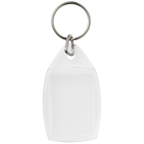 Breloczek P5 z metalowym pękiem na klucze. Wymiary wkładu do druku: 3,5 cm x 2,4 cm.