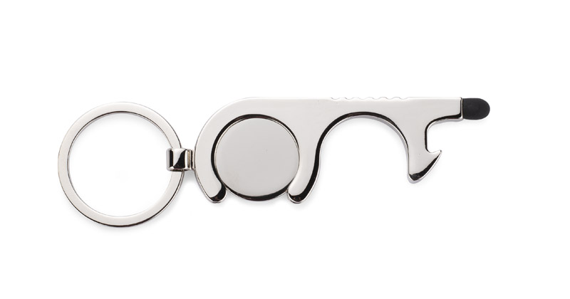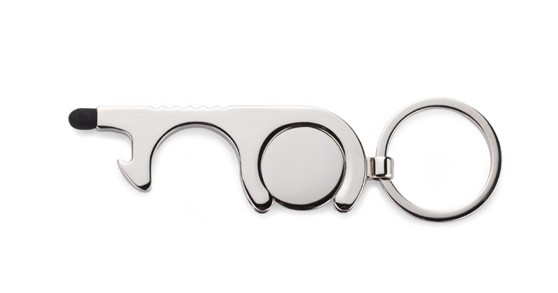 Brelok anti – touch TUS to uniwersalny dodatek do kluczy. Z jego pomocą nie trzeba dotykać bezpośrednio klamek czy przycisków np. w bankomacie. Brelok zawiera monetę do wózków sklepowych oraz pełni funkcję otwieracza do butelek. Na zakończeniu zamocowana jest gumka, dzięki której możemy zastosować go przy ekranach dotykowych. To przydatny gadżet, zwłaszcza w czasie epidemii. Brelok pakowany jest w brązową, papierową kopertę.