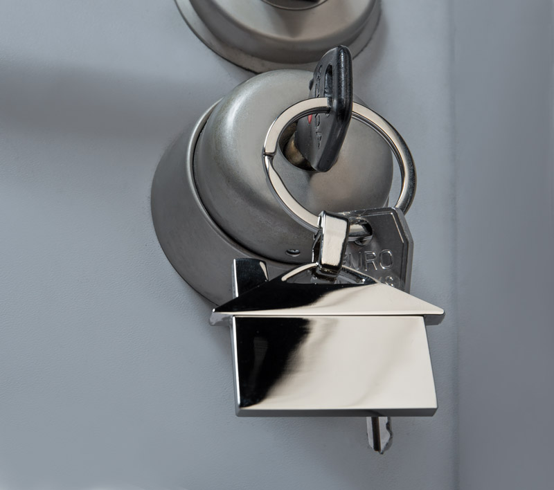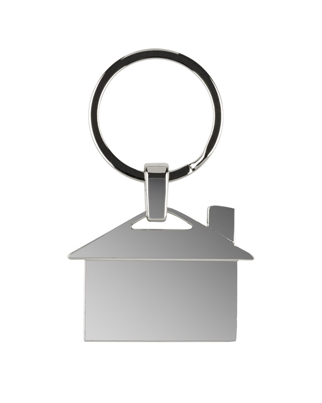 Brelok metalowy w kształcie domku. Logo grawerujemy na powierzchni breloka.