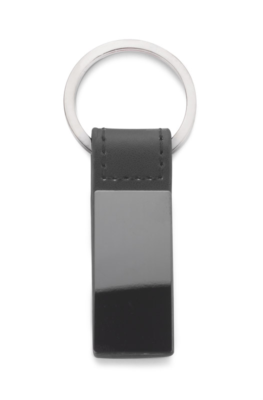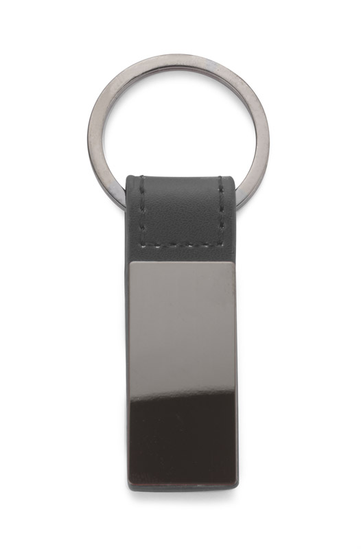 Elegancki dwustronny brelok wykonany z materiału skóropodobnego PU i metalu w kolorze grafitowym. Logo wygrawerujemy na metalowej blaszce.