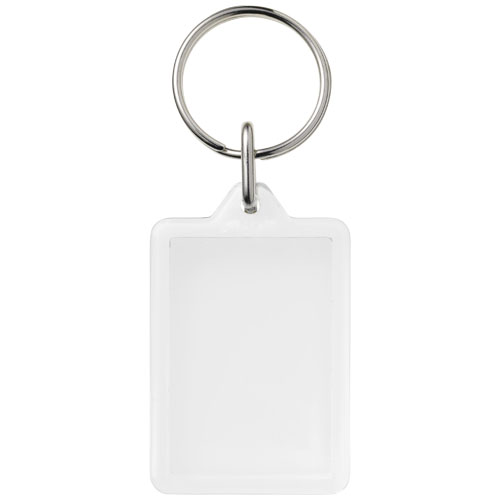 Prostokątny breloczek Y1 z metalowym pękiem na klucze. Metalowy pierścień cechuje płaski profil, który idealnie nadaje się do wysyłek. Wymiary wkładu do druku: 3,5 cm x 2,4 cm.