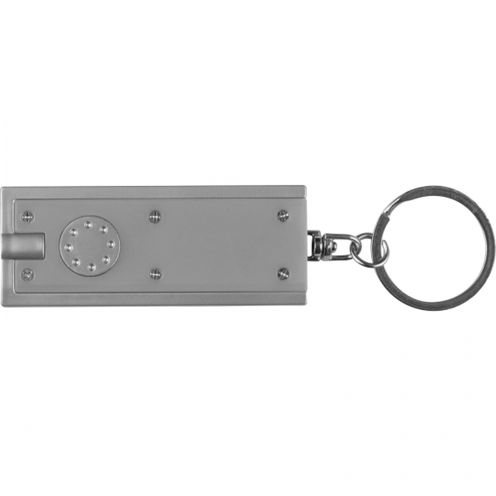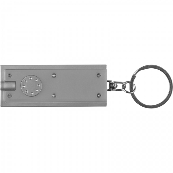 Płaski, plastikowy brelok z wbudowaną latarką LED o białym świetle, na metalowym kółku. Produkt zawiera baterie.
