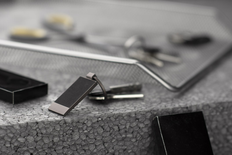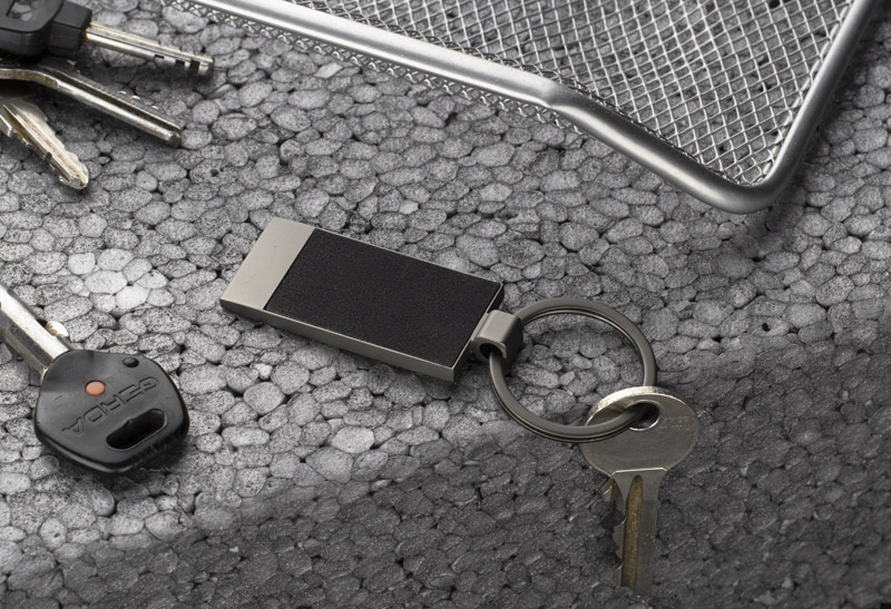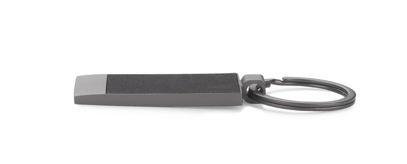 Metalowy brelok do kluczy z przyjemnym w dotyku materiałem. Pakowany w kartonik.