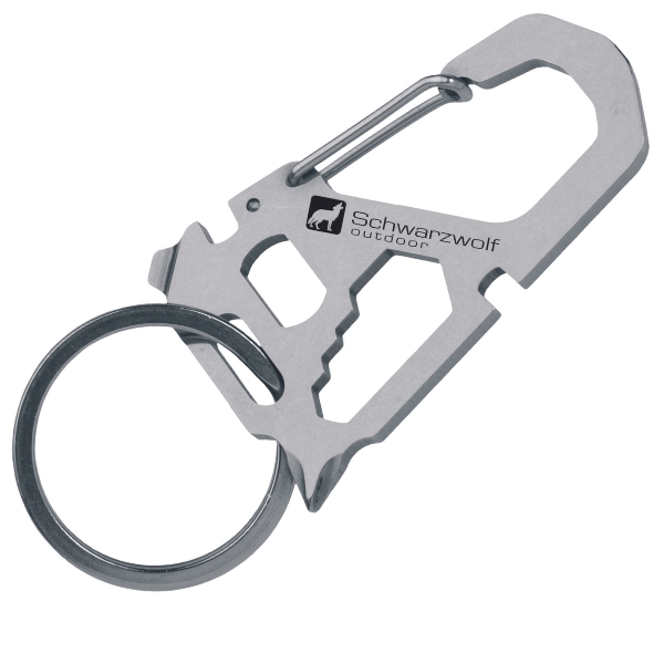 Wielofunkcyjny brelok marki Schwarzwolf zawierający 10 różnych narzędzi, w tym wkrętak Phillips, śrubokręt, klucz w 4 rozmiarach oraz magnes.