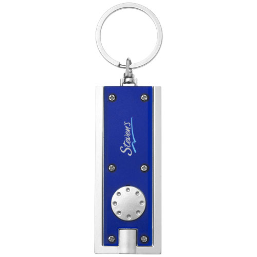 Brelok z białą diodą LED, włączany przyciskiem. Metalowe kółko do kluczy. Baterie w zestawie.