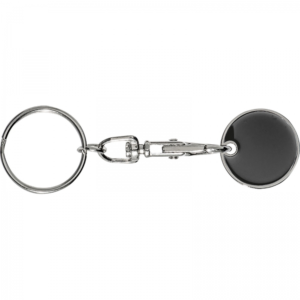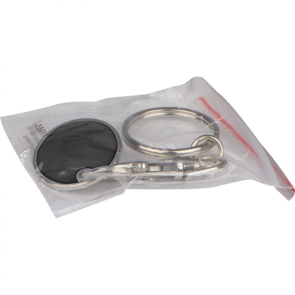 Metalowy brelok z karabińczykiem i żetonem do wózka na zakupy.
