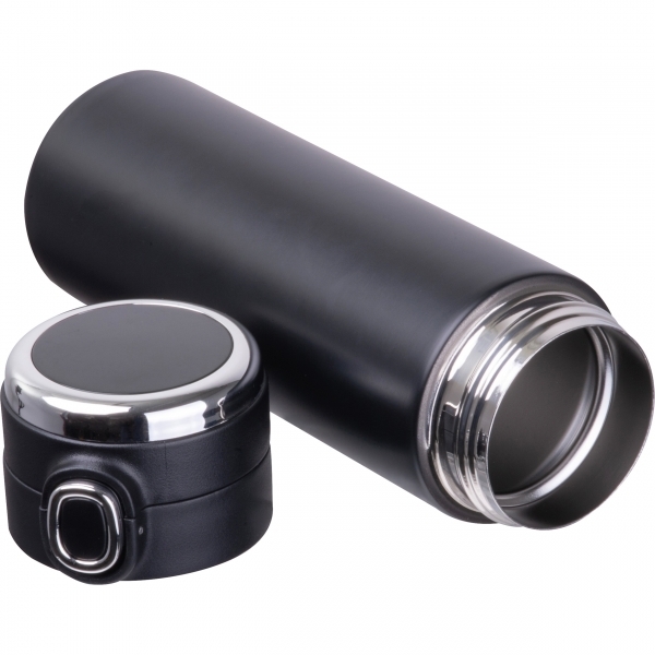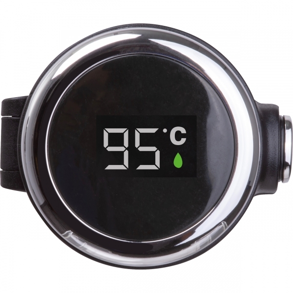 Próżniowo izolowana butelka ze stali nierdzewnej z wyświetlaczem temperatury w pokrywce i zabezpieczeniem przed otwarciem. Maksymalny wyświetlacz temperatury: 99°C.
