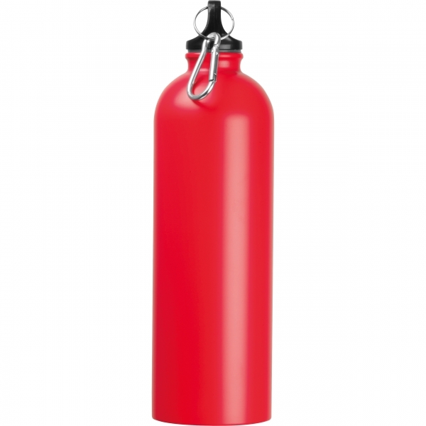Lekka, stalowa butelka o pojemności 750 ml, z zakrętką, do której przymocowany został karabińczyk, dzięki czemu butelkę można wygodnie przyczepić np. do plecaka.