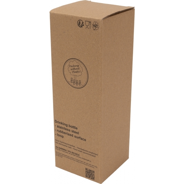 Stalowa butelka z gumowaną powierzchnią oraz pętelką do przenoszenia.