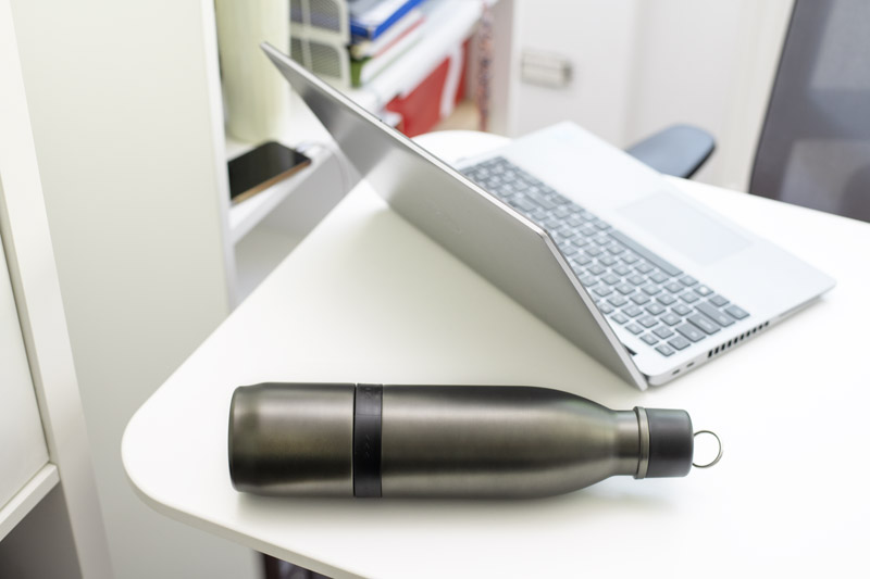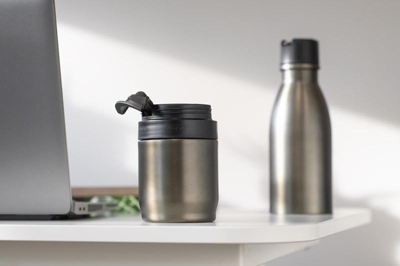 Butelka termiczna DRINNO ze stali nierdzewnej składa się z dwóch elementów (komór), które można rozdzielić i używać niezależnie. Górna część to butelka termiczna z zakrętką wyposażoną w składany uchwyt (500 ml), a dolna część to odkręcany kubek termiczny z pokrywką zamykaną na zatrzask (ok. 200 ml). Butelka utrzymuje temperaturę napoju do 10 godzin, dzięki czemu doskonale sprawdza się w pracy, w podróży i na co dzień. Całość tworzy funkcjonalne rozwiązanie do przechowywania ciepłych i zimnych napojów – idealne również jako praktyczny upominek reklamowy.