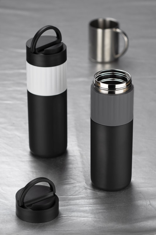 Butelka termiczna HOLDEN dzięki próżni między ściankami trzyma temperaturę ok. 12 godzin. Wykonana jest ze stali nierdzewnej 304. Posiada wygodny silikonowy uchwyt. Przykrywka wykonana z tworzywa posiada w swojej konstrukcji stojak do telefonu