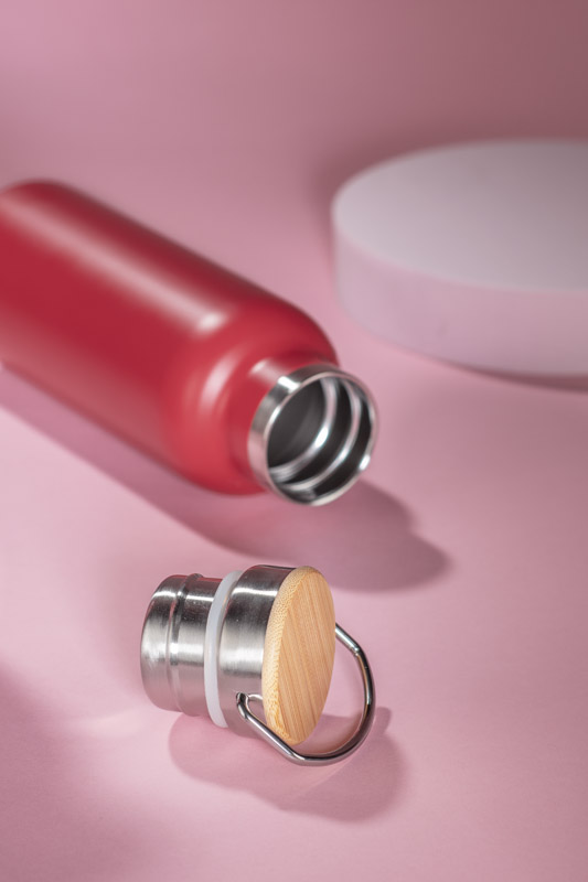 Butelka termiczna KAAN wykonana ze stali nierdzewnej o podwyższonym standardzie. Posiada ciekawy design uchwytu oraz zakrętki z bambusowym wykończeniem. Posiada próżnię między ściankami, dzięki czemu utrzymuje temperaturę napoju do około 10 godzin.