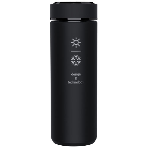 Butelka termiczna o podwójnych ściankach i pojemności 450 ml wykonana ze stali nierdzewnej. Butelka wyposażona jest w termometr. Dzięki systemowi „Touch & Light” temperatura napoju wyświetlana jest na zakrętce butelki (w stopniach Celsjusza). Odpowiednia do gorących i zimnych napojów. Dostarczana w cylindrycznym pudełku upominkowym wykonanym z papieru z recyklingu. Wymiary: 47 x 225 mm. Długość długopisu: CR 2450 (3V). Baterii nie można wymienić. Może wyświetlić temperaturę 20 000 razy.