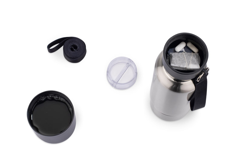 Butelka termiczna RON to doskonały wybór dla aktywnych osób, które cenią sobie zarówno wygodę, jak i funkcjonalność. Będzie idealna na trening i spontaniczne wyprawy. Butelka jest wyposażona w karabińczyk oraz dwie smycze: krótką i długą na zmianę, umożliwiające wygodne przenoszenie i łatwe dostosowanie do różnych sytuacji. Wystarczy założyć ją na nadgarstek podczas biegu lub zawiesić na plecach podczas wędrówki. Dodatkowo RON posiada zamknięcie z praktycznym schowkiem na drobiazgi (np. tabletki czy suplementy diety). Unikalna podstawa z tworzywa, która po wykręceniu staje się dodatkowym kubkiem, eliminuje ryzyko poparzenia języka i pozwala na wygodniejsze spożywanie napoju.