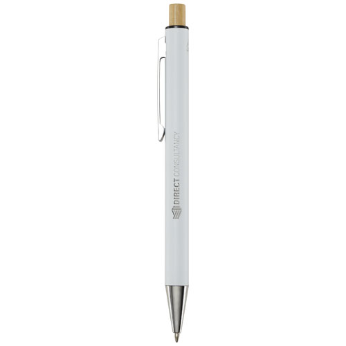 Cyrus długopis wykonany z aluminium pochodzącego z recyklingu, którego produkcja wymaga mniej energii niż w przypadku aluminium wyprodukowanego z surowców. Ogranicza również ilość odpadów na wysypiskach śmieci i pomaga chronić zasoby naturalne w celu zmniejszenia emisji gazów cieplarnianych. Przycisk jest wykonany z bambusa. Kolor tuszu: Niebieski. Żywotność: 800 metrów. Rozmiar stalówki: 1,00 mm.