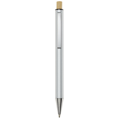Cyrus długopis wykonany z aluminium pochodzącego z recyklingu, którego produkcja wymaga mniej energii niż w przypadku aluminium wyprodukowanego z surowców. Ogranicza również ilość odpadów na wysypiskach śmieci i pomaga chronić zasoby naturalne w celu zmniejszenia emisji gazów cieplarnianych. Przycisk jest wykonany z bambusa. Kolor tuszu: Czarny. Żywotność: 800 metrów. Rozmiar stalówki: 1,00 mm.