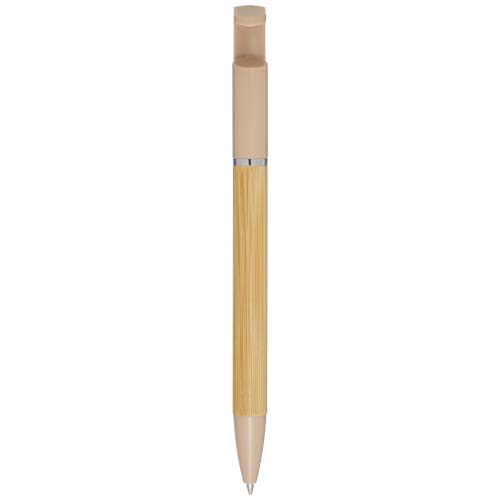 Bambusowy długopis, który pełni także funkcję uchwytu na telefon. Przycisk i środkowy pierścień wykonane są z tworzyw sztucznych pochodzących z recyklingu, końcówka z mosiądzu, a korpus z bambusa pozyskiwanego w sposób zrównoważony. Kolor tuszu: Czarny. Żywotność: 1000 metrów. Rozmiar stalówki: 1,0 mm.