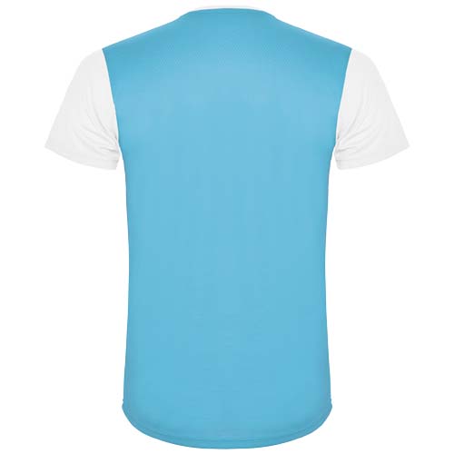 Łatwoschnący, techniczny i oddychający materiał. Okrągły kołnierzyk. Połączenie dwóch materiałów poliestrowych na plecach i ramionach. Materiał o splocie Birdseye z przodu i oddychająca siateczka 3D z tyłu. Materiał przygotowany na wchłanianie wilgoci. Ozdobny ścieg zygzakowy po bokach i na ramionach. Wzór na plecach nieco dłuższy. Usuwalna etykieta.
