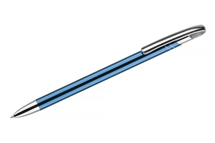 Cienki i zgrabny metalowy długopis w kolorze o metalicznym wykończeniu. Klip i końcówki w kolorze srebrnym chromowanym. AVALO wyróżnia się wśród podobnych długopisów oryginalnym projektem klipu. Korpus ozdobiony został dwoma skośnymi paskami w kolorze srebrnym. Wkład o grubości 0,7 mm w kolorze niebieskim.