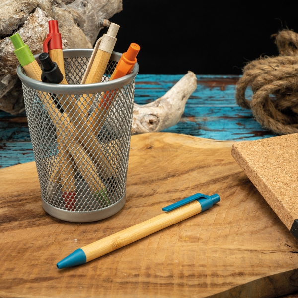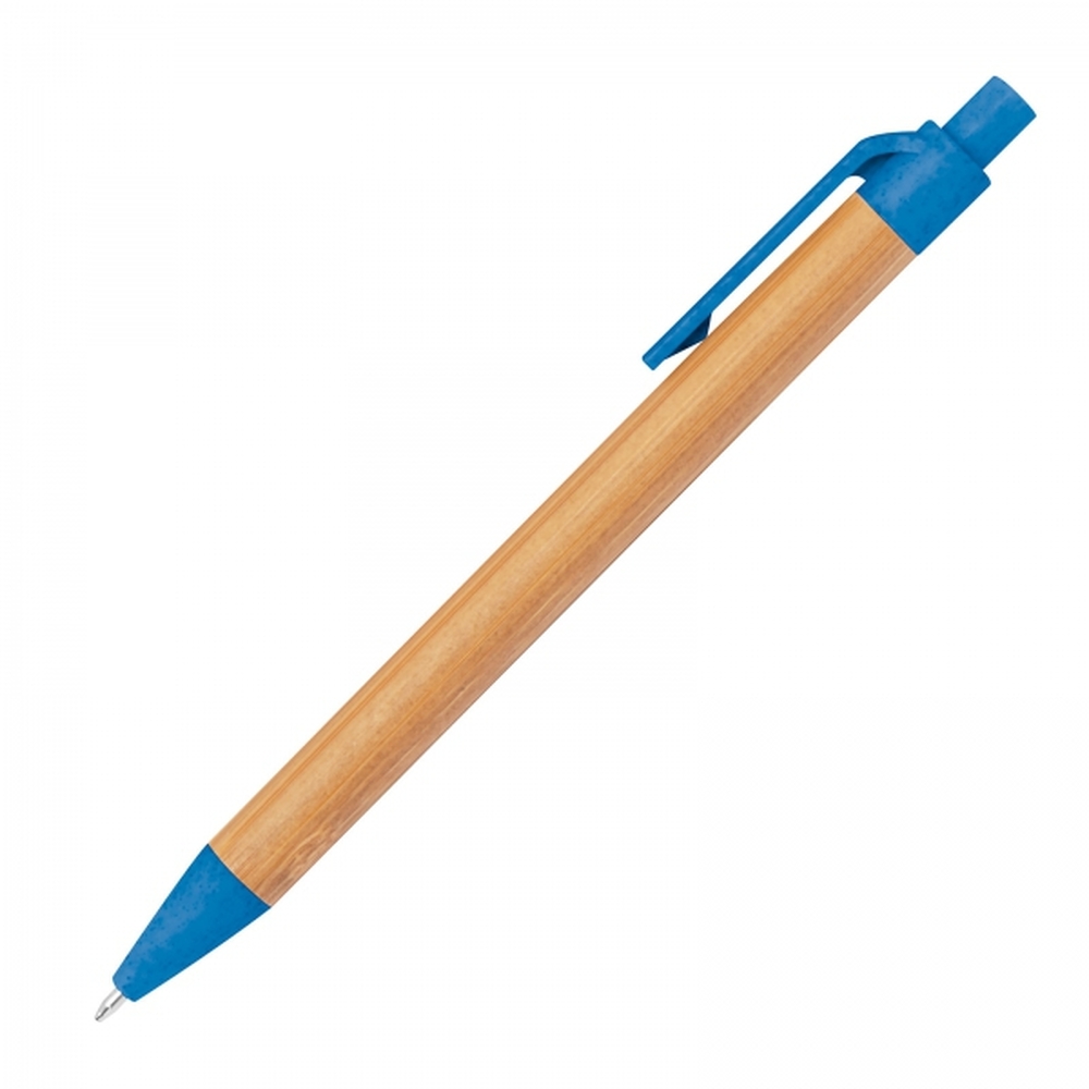 Długopis wykonany z bambusa z kolorowymi elementami wykonanymi z włókna pszenicznego. Posiada klikany mechanizm i wkład w kolorze niebieskim.