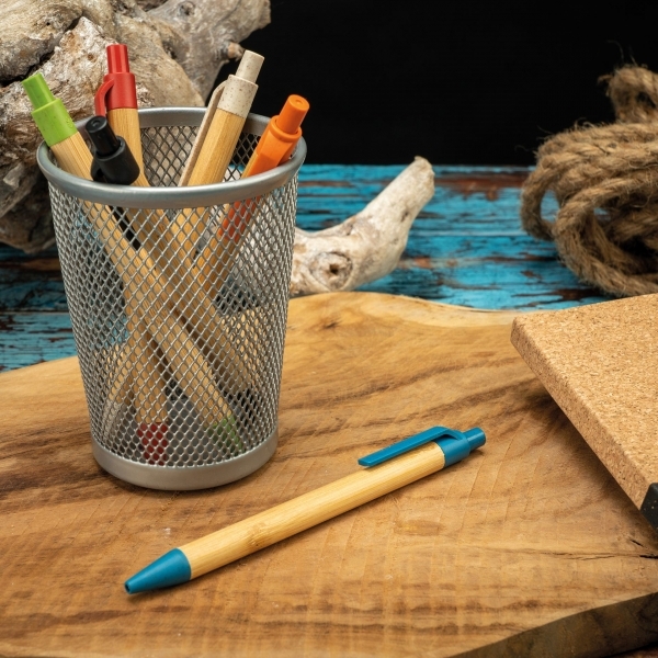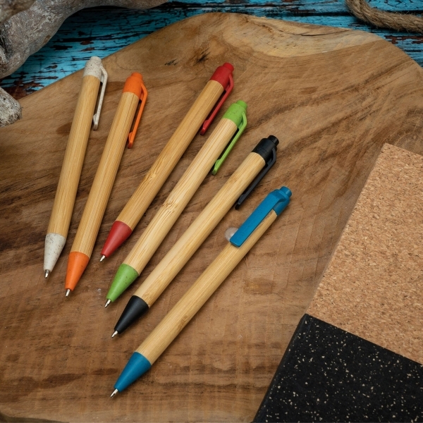 Długopis wykonany z bambusa z kolorowymi elementami wykonanymi z włókna pszenicznego. Posiada klikany mechanizm i wkład w kolorze niebieskim.