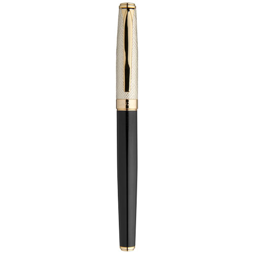 Luksusowe pióro kulkowe, ze złotą skórzaną zatyczką i lakierowanymi złotymi elementami, zapakowane w pudełko upominkowe Luxe. Dolny korpus wykonany jest z lakierowanego mosiądzu, a górny z mosiądzu i PU. Pióro kulkowe: 14 cm x 1,15 cm, waga: 32 gr, żywotność: 500 m.