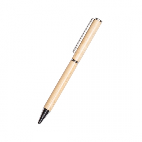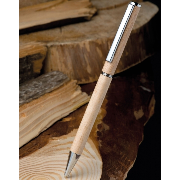 Automatyczny długopis do produkcji, którego użyto drewna klonowego jest w 100% ekologiczny. Posiada metalowe elementy, piszę na niebiesko. Długopis pakowany jest w tekturowe pudełko.