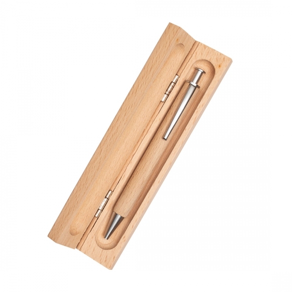 Długopis wykonany z drewna, wyposażony w mechanizm przyciskowy. Długopis posiada wkład piszący na niebiesko. Pakowany w eleganckie drewniane w etui.