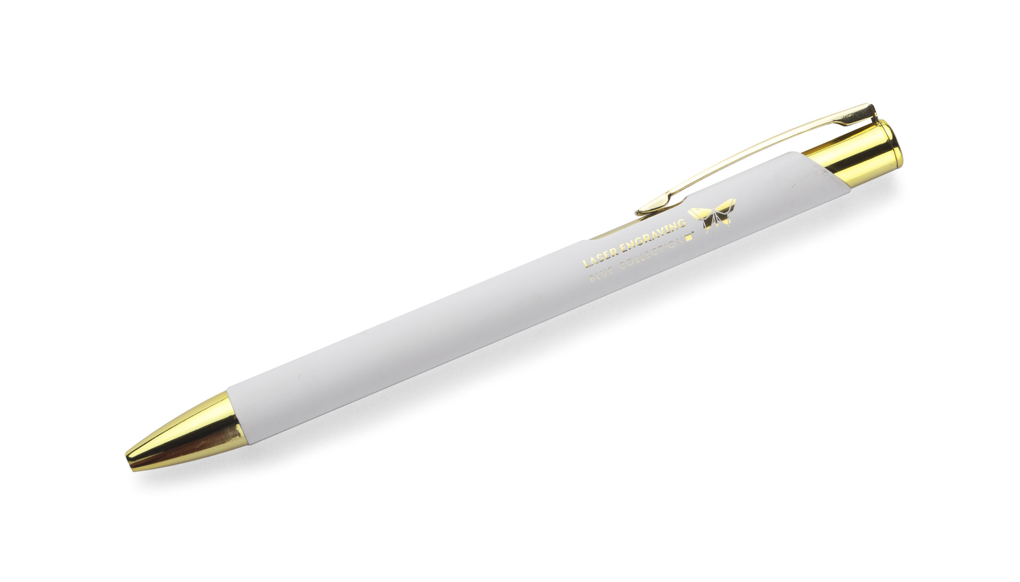 GOLDEN to długopis wyróżniający się przyjemną w dotyku gumowaną powierzchnią oraz wyjątkowo eleganckimi złotymi wykończeniami. Korpus wykonany z aluminium. Możliwość wygrawerowania logo w kolorze złotym, które doskonale pasuje do wykończeń długopisu. Długopis automatyczny. Wkład typu G2 w kolorze niebieskim.