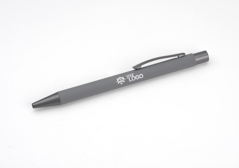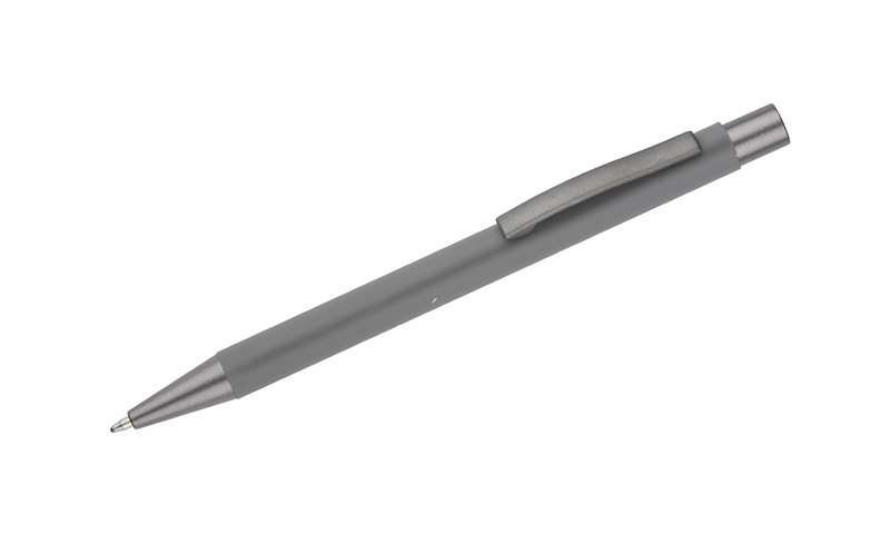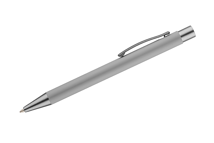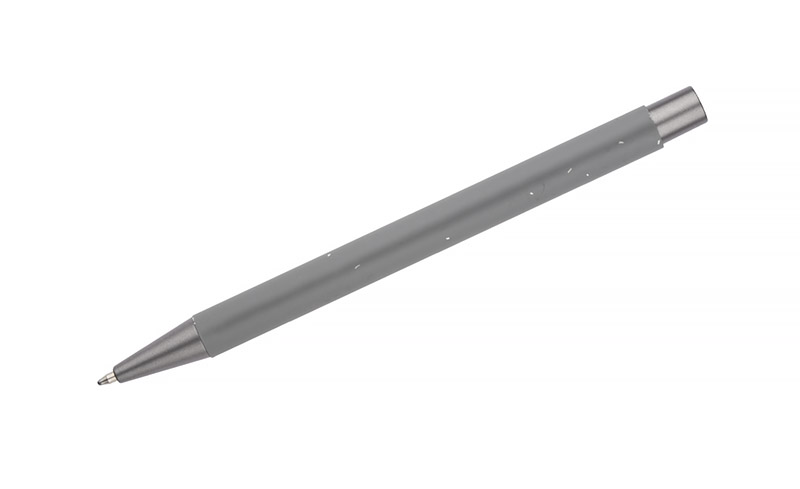 Długopis GOMA to prosty design połączony z przyjemną w dotyku gumowaną powierzchnią. Całość jest utrzymana w lekkich, matowych barwach. Wykonany z aluminium. Wykończenia w kolorze grafitowym. Wkład w kolorze czarnym.
