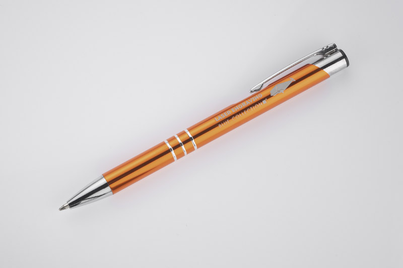 Metalowy długopis o metalizowanej chromowanej powierzchni. Długopis automatyczny z 3 ringami i niebieskim wkładem. Logo grawerujemy na powierzchni długopisu.
