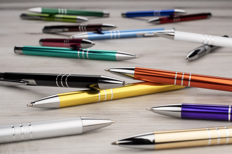 Metalowy długopis o metalizowanej chromowanej powierzchni. Długopis automatyczny z 3 ringami i niebieskim wkładem. Logo grawerujemy na powierzchni długopisu.
