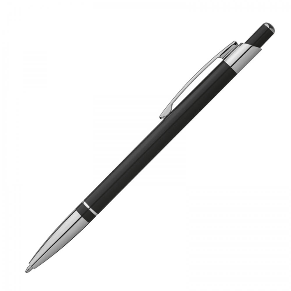 Długopis metalowy z wkładem piszącym na niebiesko.