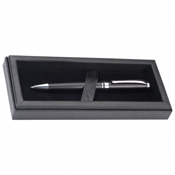 Długopis metalowy CLAYTON z powłoką matową i ze srebrnymi wykończeniami. Długopis posiada wkład piszący na niebiesko.