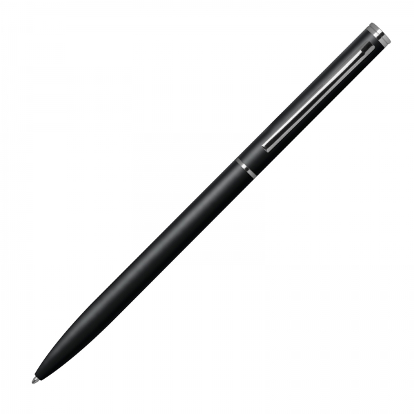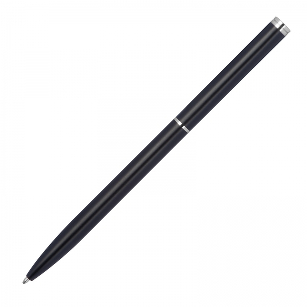 Metalowy długopis z chromowanym klipsem i wkładem piszącym na niebiesko.