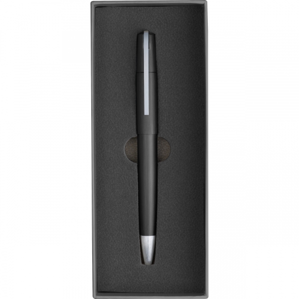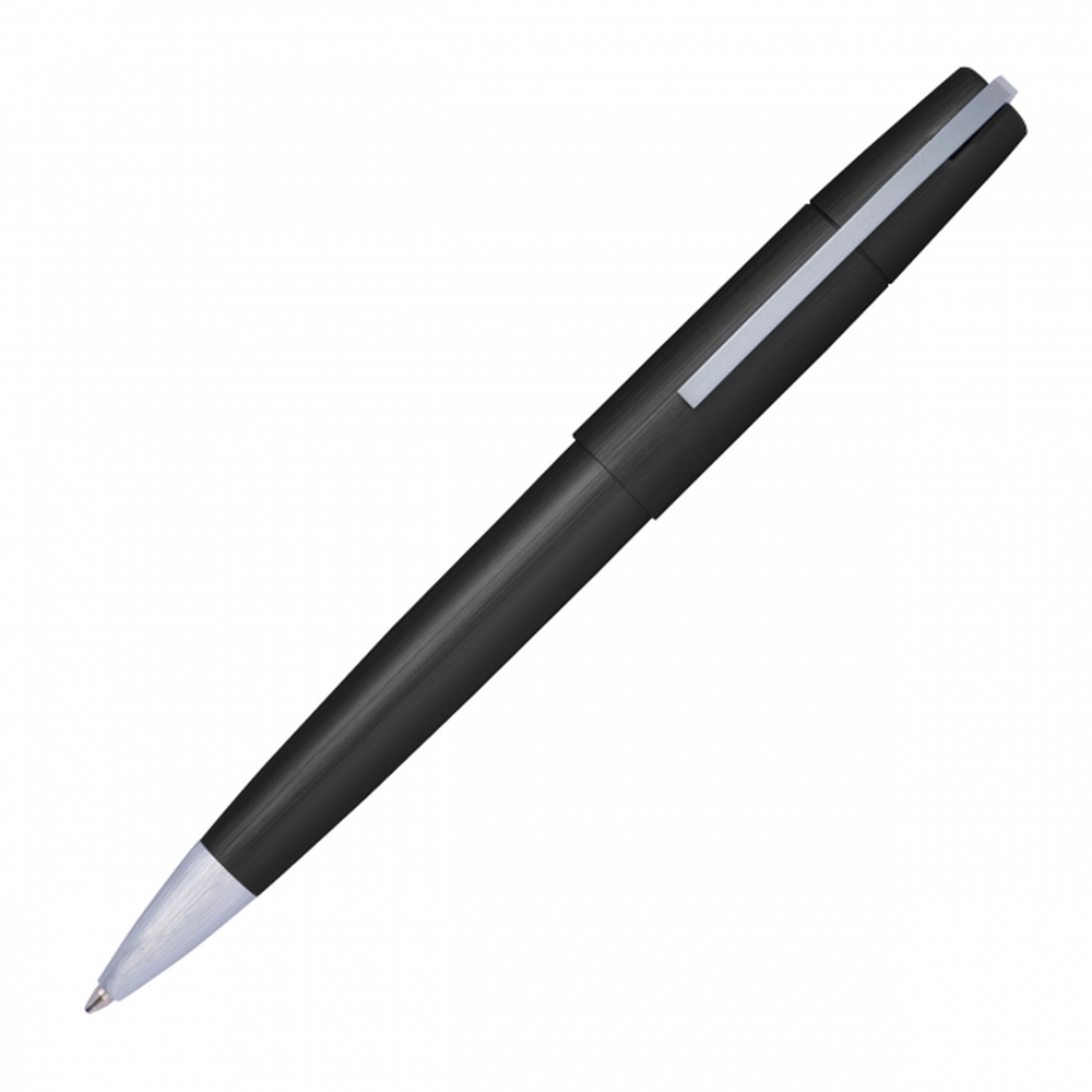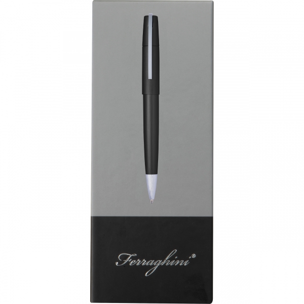 Przekręcany, metalowy długopis marki Ferraghini, ze srebrnymi akcentami i dużym wkładem piszącym na niebiesko.