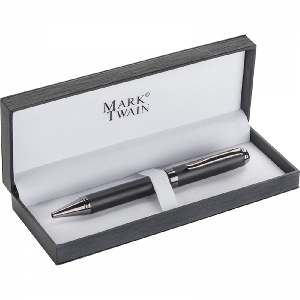 Długopis metalowy marki Mark Twain z chromowanymi elementami i piszącym na niebiesko, dużym wkładem. Długopis zapakowany w ozdobne pudełko.