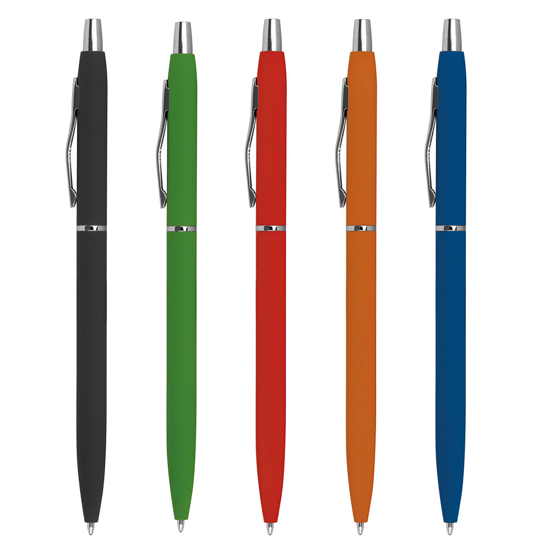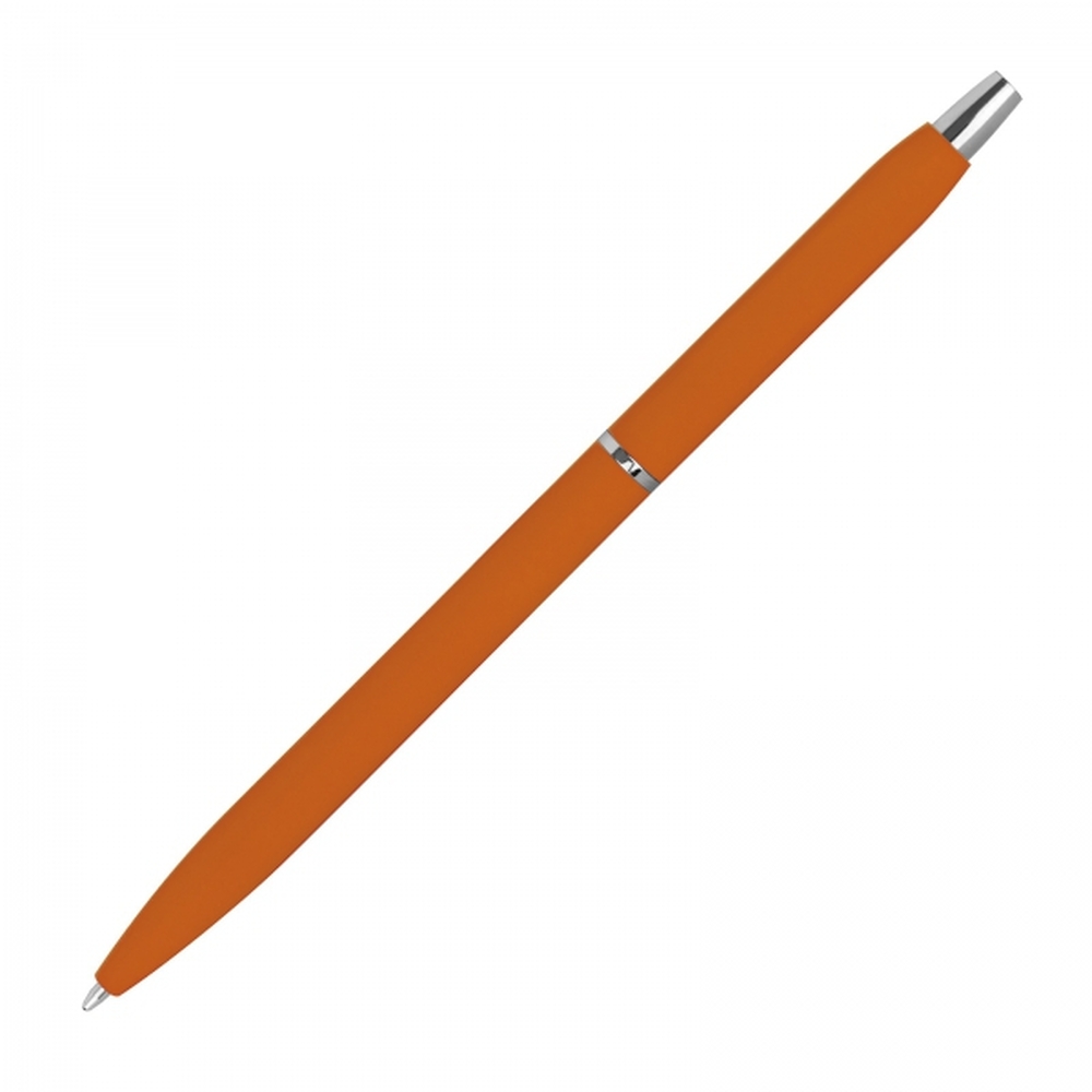Smukły, gumowany długopis metalowy z wkładem piszącym na niebiesko.