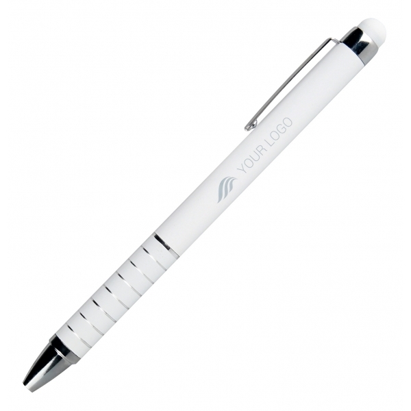 Długopis metalowy z mechanizmem obrotowym i gumką do obsługi ekranów dotykowych. Posiada wkład piszący na niebiesko.