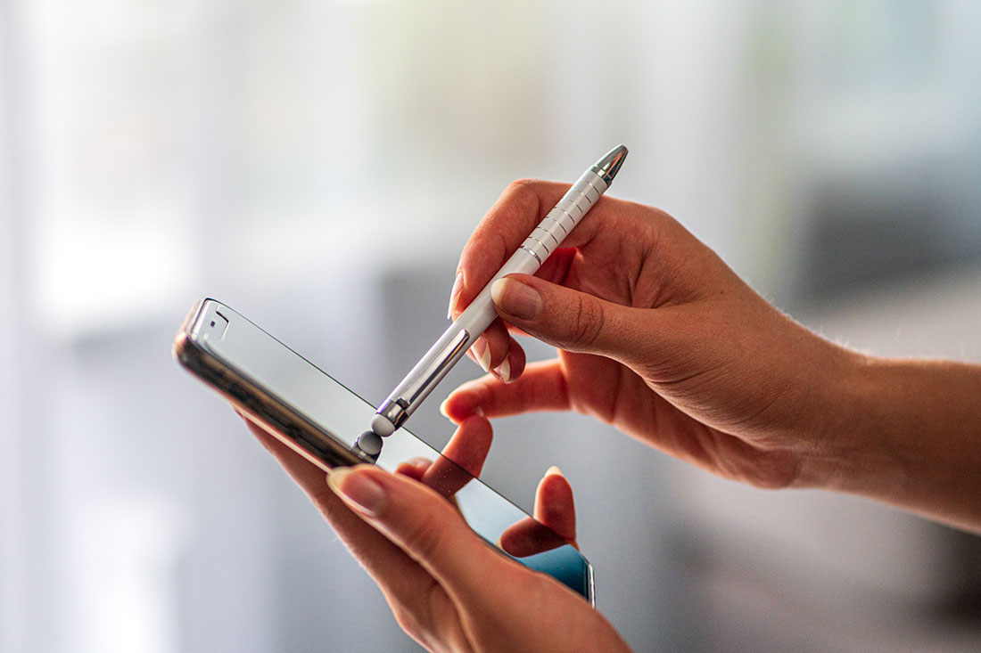 Długopis metalowy z mechanizmem obrotowym i gumką do obsługi ekranów dotykowych. Posiada wkład piszący na niebiesko.