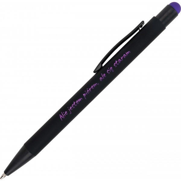 Metalowy długopis z gumowaną powierzchnią soft touch i końcówką do obsługi ekranów dotykowych.