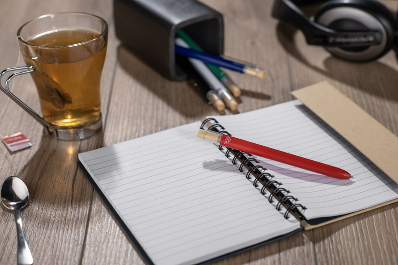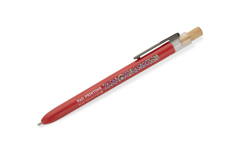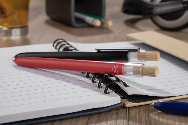 Długopis OCEANO wykonany jest z materiału pochodzącego z odpadów ocean bound – tworzyw zbieranych z terenów przybrzeżnych, zanim trafią do mórz i oceanów. Posiada lakierowany korpus, bambusowy przycisk oraz metalowy klips, co nadaje mu nowoczesny wygląd i przyjemne w użytkowaniu wykończenie. Automatyczny mechanizm ułatwia codzienną obsługę, a wkład typu G2 z żelowym tuszem o grubości pisania 0,5 mm zapewnia płynny i precyzyjny zapis.