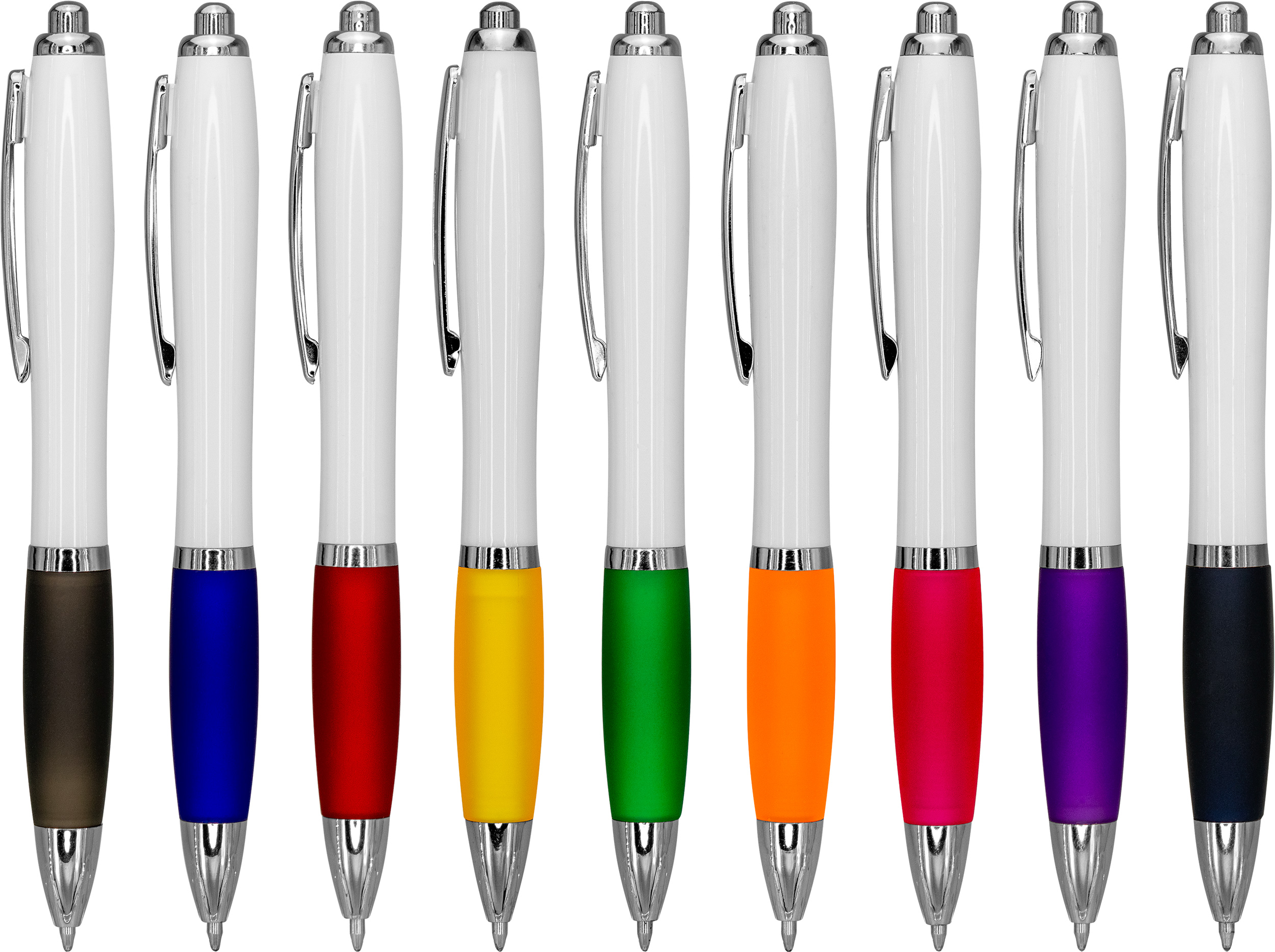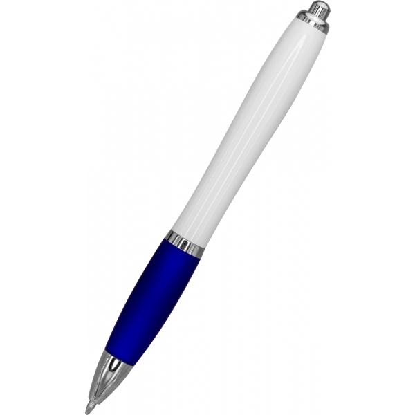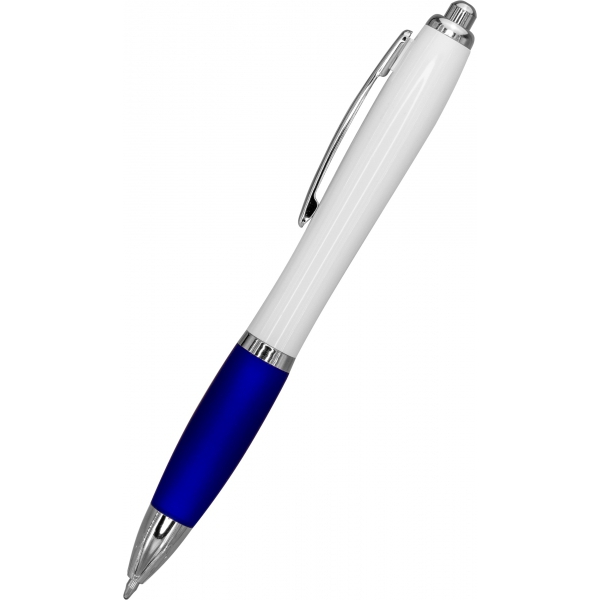 Długopis plastikowy z białym korpusem i kolorową gumką ułatwiającą trzymanie. Wyposażony w metalowy klips i duży wkład piszący na niebiesko.