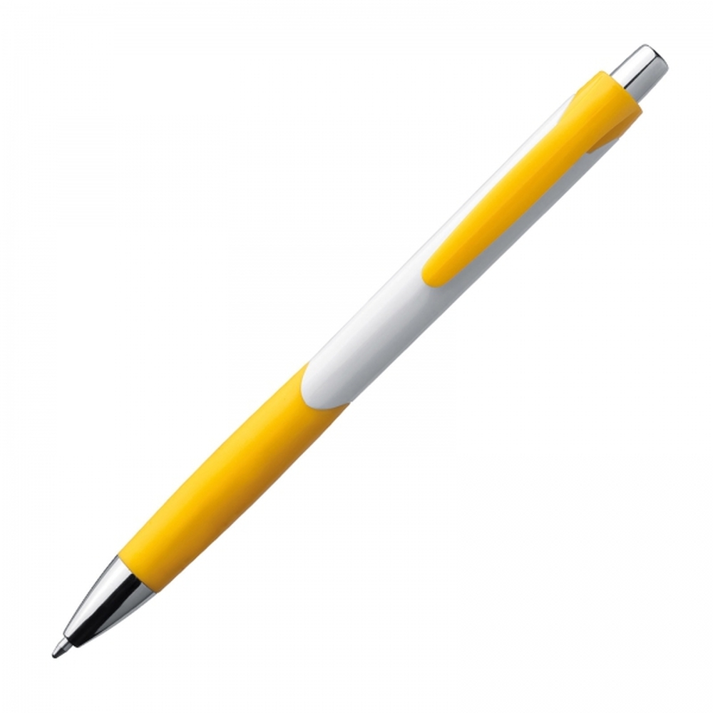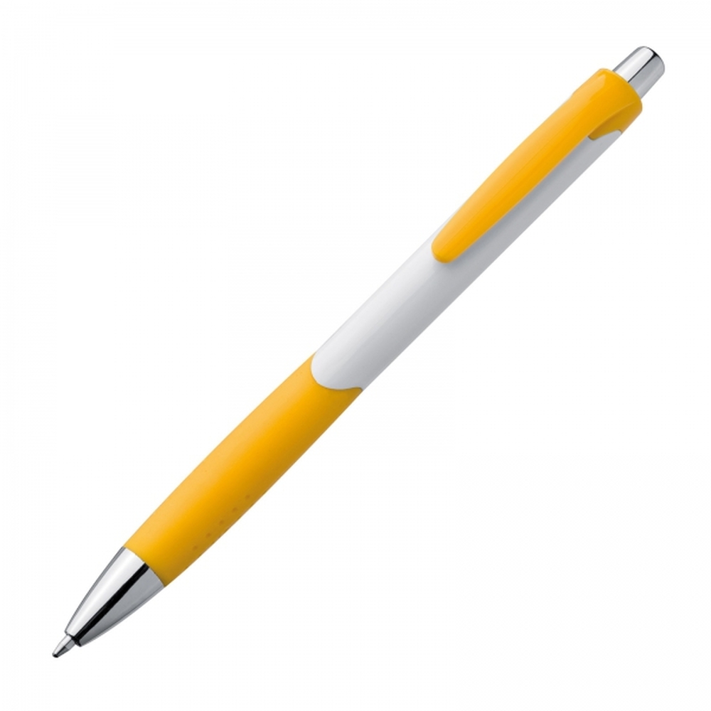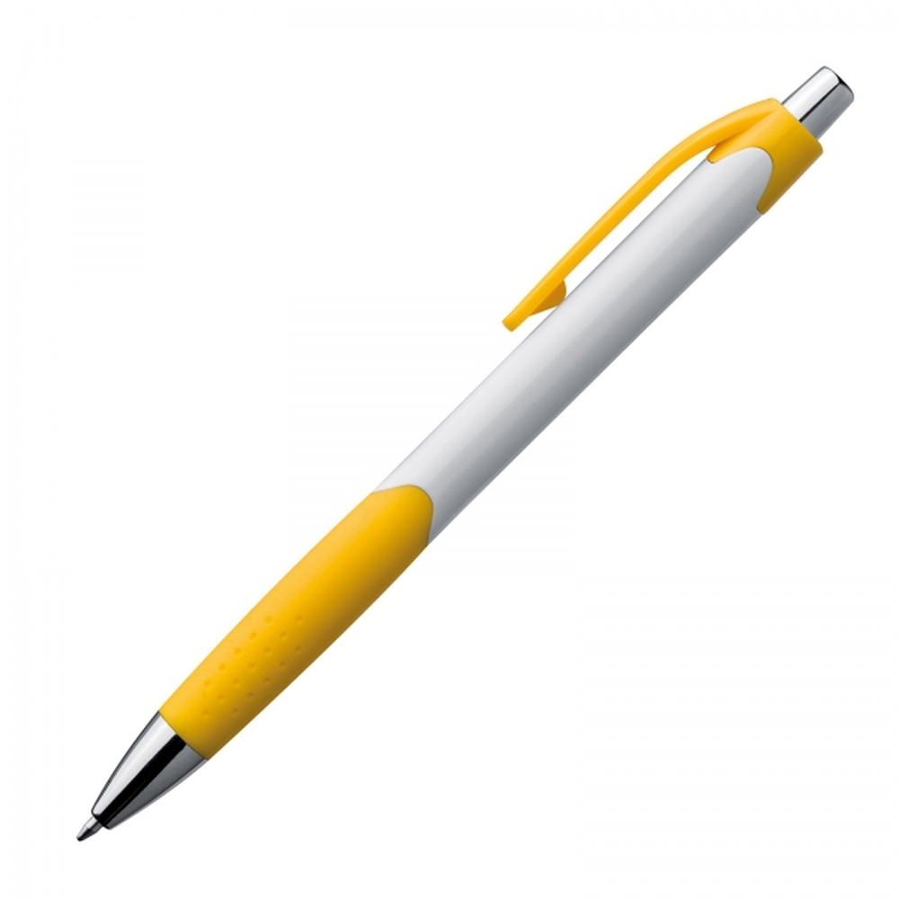 Długopis plastikowy, wyposażony w klips i gumową strefę chwytu oraz niebieski wkład.