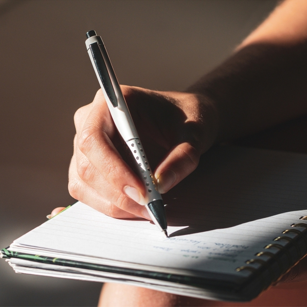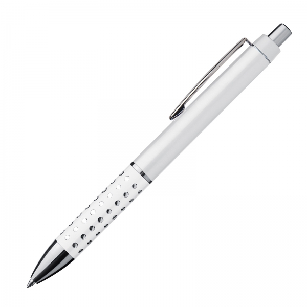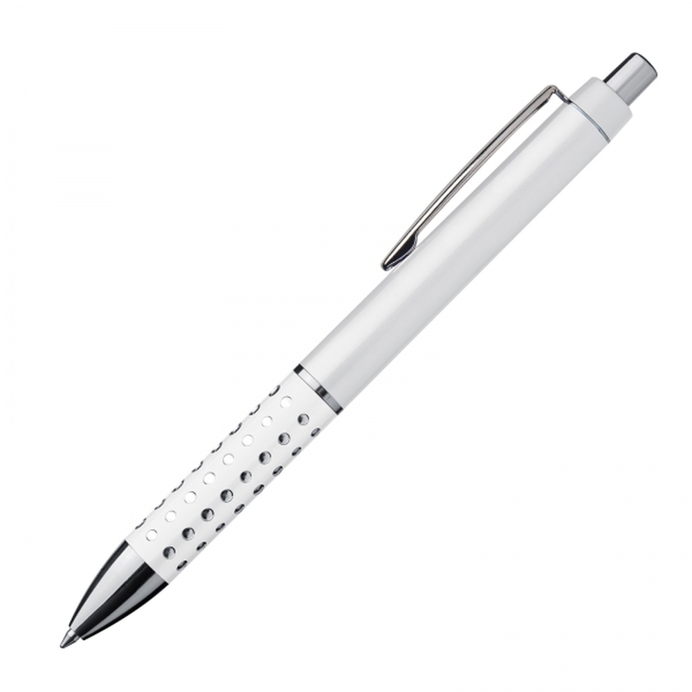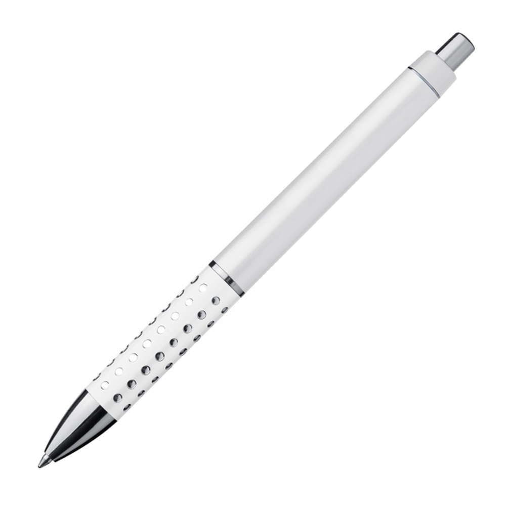 Plastikowy długopis o ozdobnym korpusie, z wkładem piszącym na niebiesko.