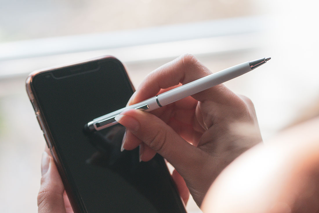 Smukły długopis plastikowy z mechanizmem obrotowym. Posiada wkład piszący na niebiesko i końcówkę do obsługi ekranów dotykowych.