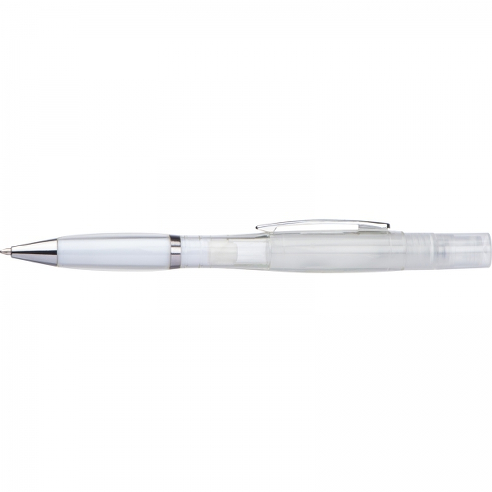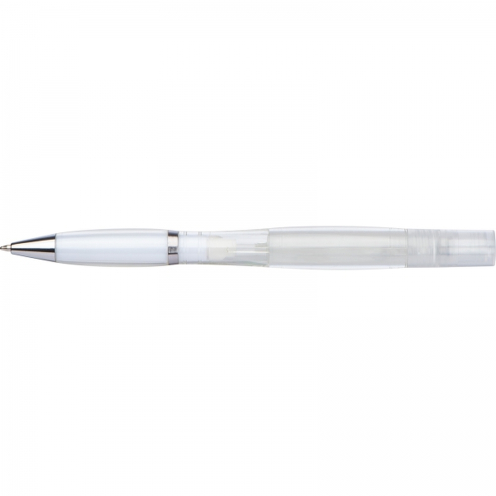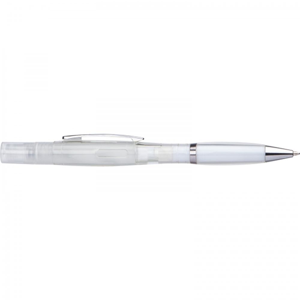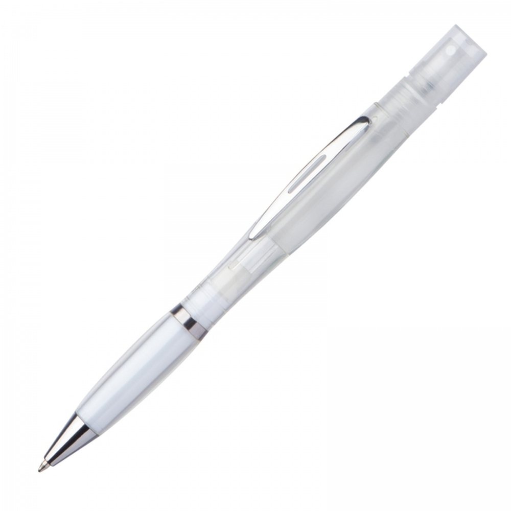 Plastikowy długopis z rozpylaczem to innowacyjne narzędzie łączące wygodę pisania z funkcją atomizera, który umożliwia aplikację płynów dezynfekujących lub perfum. Wyposażony w praktyczny, przekręcany mechanizm, zapewnia płynne i komfortowe pisanie dzięki wkładowi w kolorze niebieskim. Wbudowany atomizer pozwala na szybkie i higieniczne odświeżenie dłoni lub delikatne perfumowanie w dowolnym miejscu – idealne rozwiązanie zarówno do biura, szkoły, jak i podczas podróży. Kompaktowa, lekka konstrukcja sprawia, że długopis łatwo zmieści się w kieszeni czy torbie, łącząc w sobie funkcjonalność i nowoczesny design.