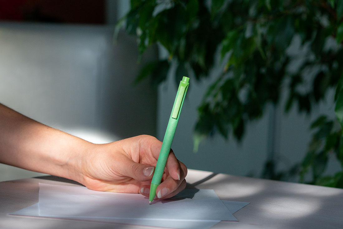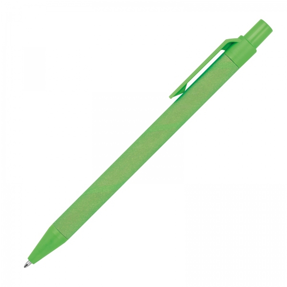 Ekologiczny długopis wykonany z tektury (pochodzącej z recyklingu) oraz specjalnie utwardzanych włókien kukurydzianych (końcówka pisząca, klips i mechanizm wysuwania wkładu). Długopis posiada niebieski wkład.