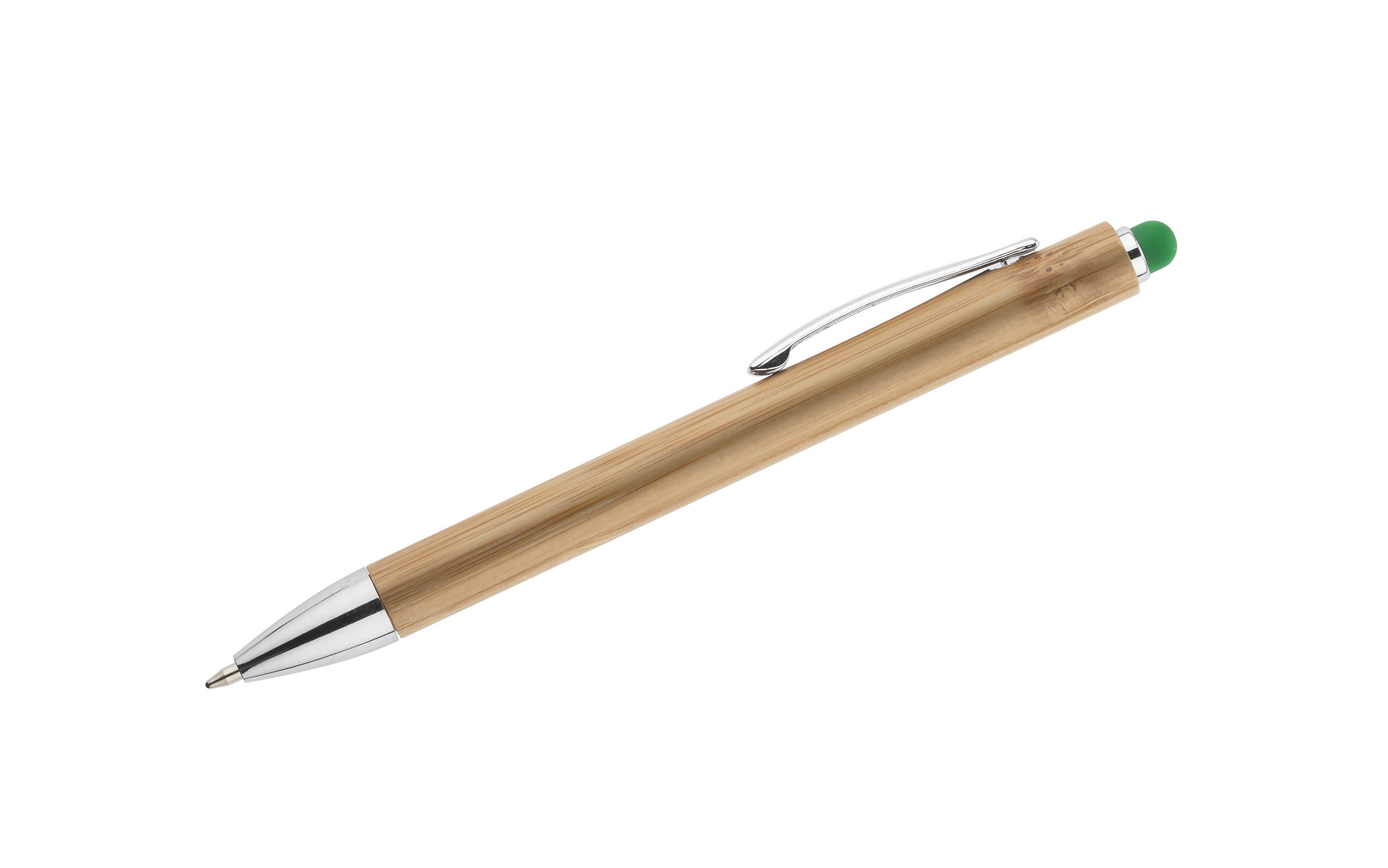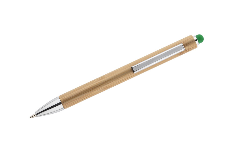 TUSO to długopis, którego korpus został w całości wykonany z bambusa. Chromowane wykończenia nadają mu elegancji. Kolorowa końcówka do obsługi ekranów dotykowych stanowi ciekawą ozdobę. Długopis automatyczny. Wkład typu G2 w kolorze niebieskim.